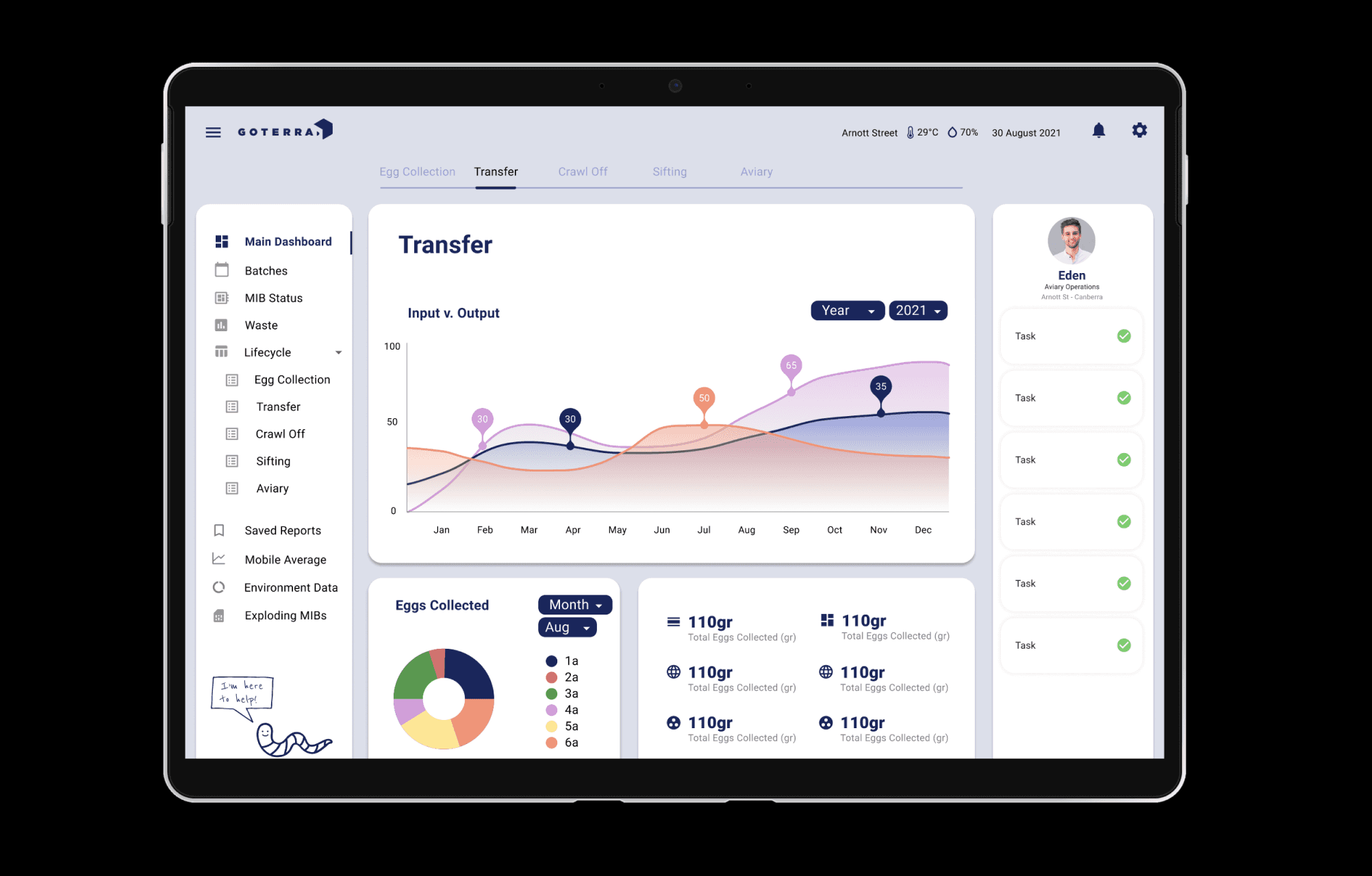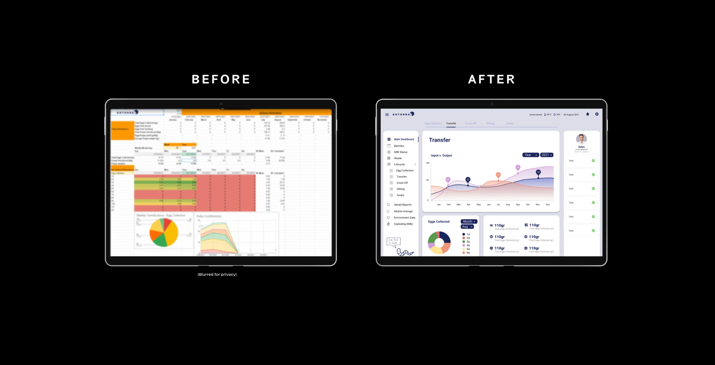 The Process In the project, contextual inquiry was vital as it allowed us to observe the breeding and feeding process of maggots, gaining valuable insights. We investigated why Goterra didn't use an existing data input platform and decided a personalized system would be more suitable after consulting their software engineer. Analyzing the data involved understanding complex steps, including mathematical formulas. User task flows helped map the production team's processes, highlighting manual data recording on paper. We prioritized eliminating this practice. To address the root problem, we identified three key elements for the MVP: 01. Step-by-step data input system to guide and reduce errors. 02. Continuous temperature and humidity data for maggots' well-being. 03. Dashboards for production summaries and daily requirements. These elements aimed to simplify the process effectively as well as reducing mistakes made while takeing physical notes.